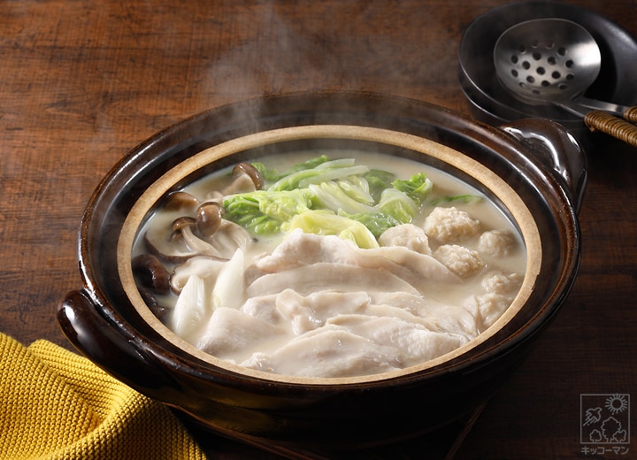 鍋に水、和風だしの素を入れて沸騰させ、豚バラスライス、つみれ、お好みの大きさに切った野菜を入れて煮る。 |
